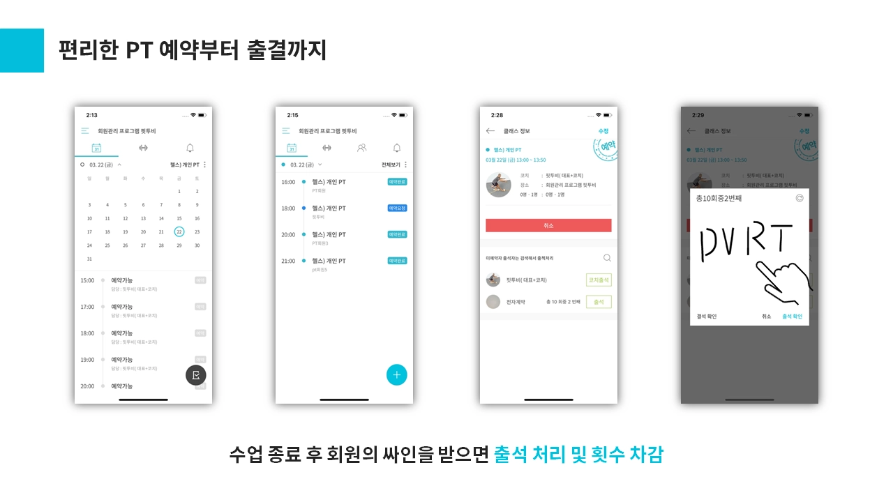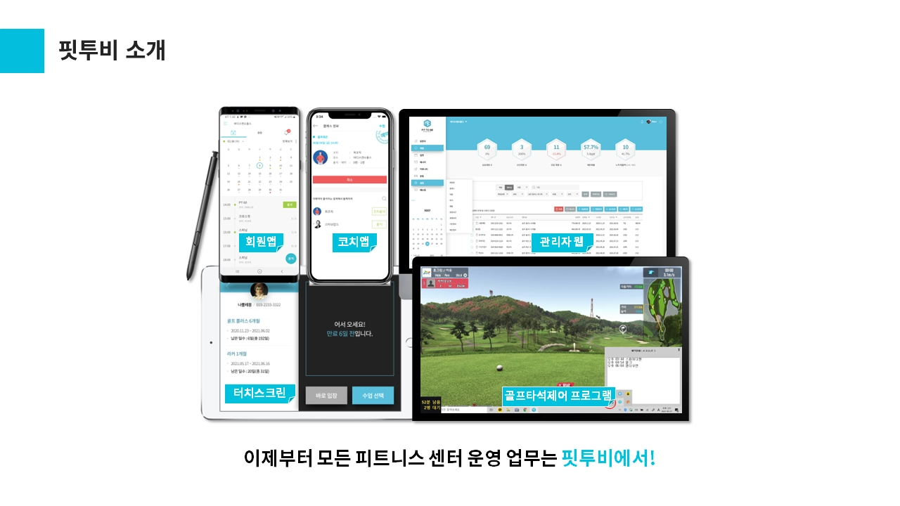 핏투비는 기존에 사용하던 프로그램과는 달리, 한눈에 알아보기 쉬운 인터페이스와 사용이 간편한 예약, 출석 기능 등으로 센터 대표님들과 강사님들에게 많은 호응을 얻고 있습니다. 또한, 회원관리 프로그램에서 필요한 기능들만을 제공하여 사용자들이 필요없는 기능으로 인해 혼란스러워하지 않아도 됩니다.
