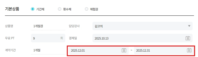 회원 결제 탭- 계약기간을 당일보다 뒤의 날짜로 변경 하단 수정하기클릭 - 하단 회원권 삭제클릭