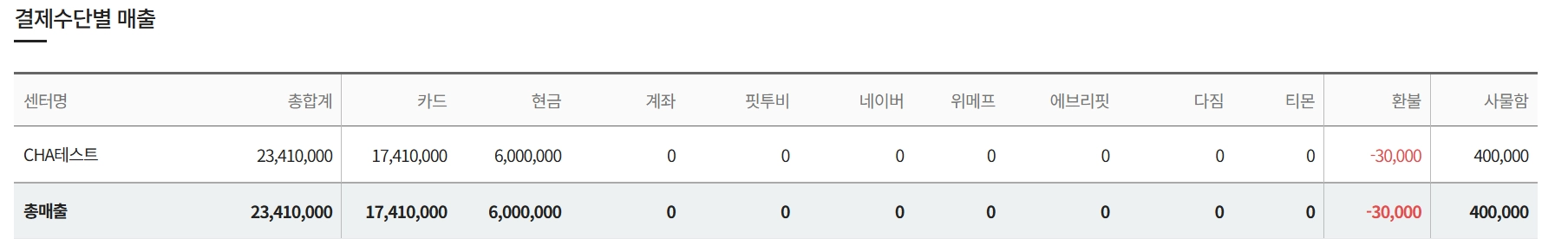 핏투비페이를 포함한 모든 전체 매출 현황을 확인 할 수 있습니다.