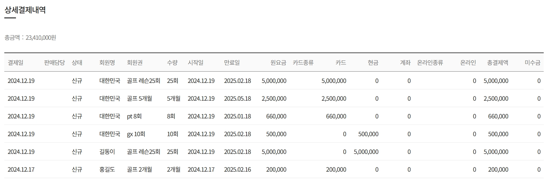 결제내역 확인: 하단의 특정 결제 내역을 클릭하면 해당 회원의 결제건으로 이동합니다.