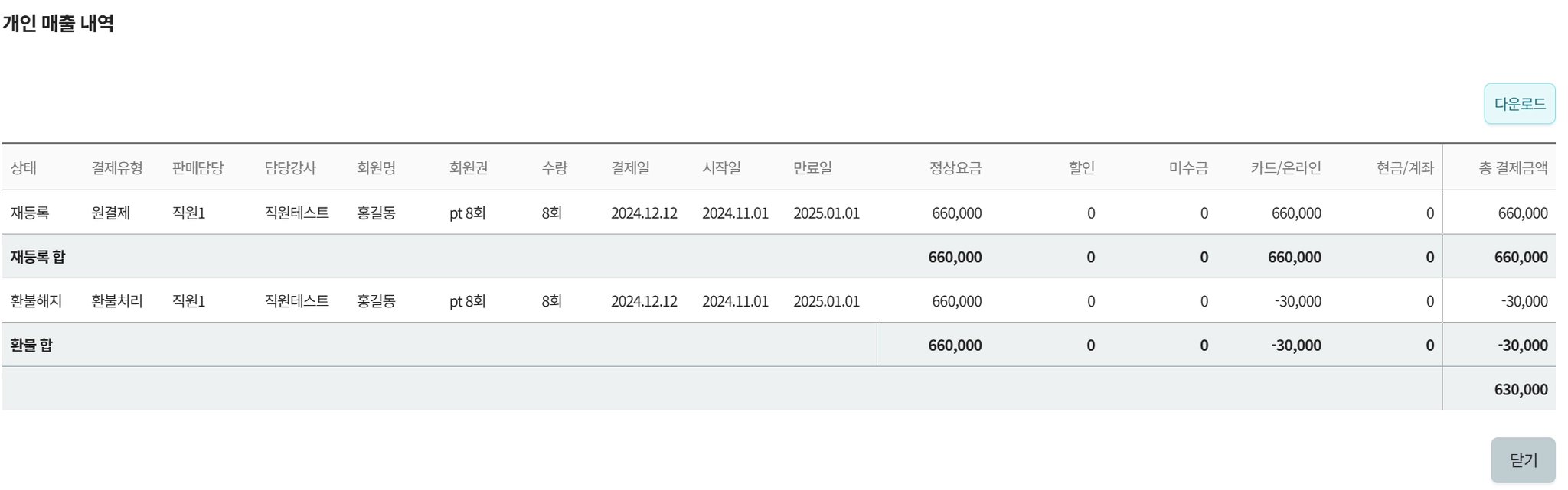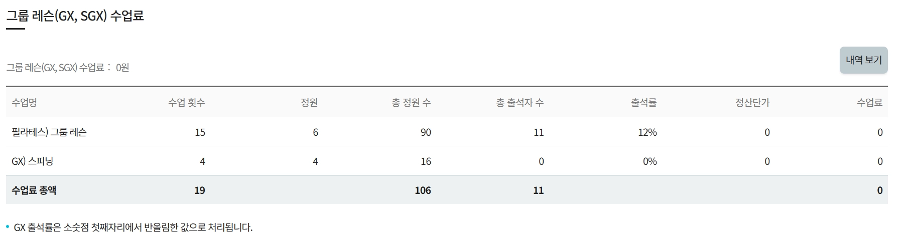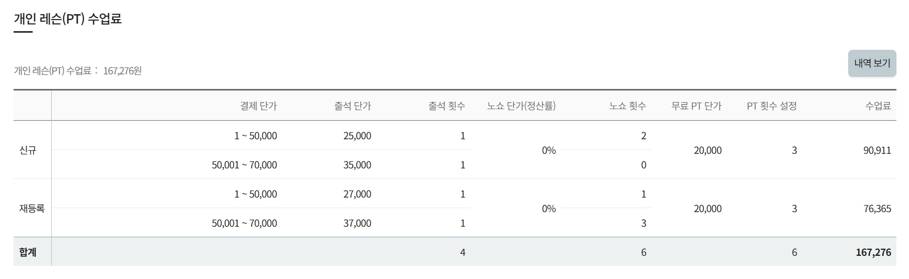 해당직원의 1:1PT 수업료와 GX 수업료의 내역을 확인 할 수 있습니다.