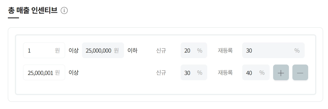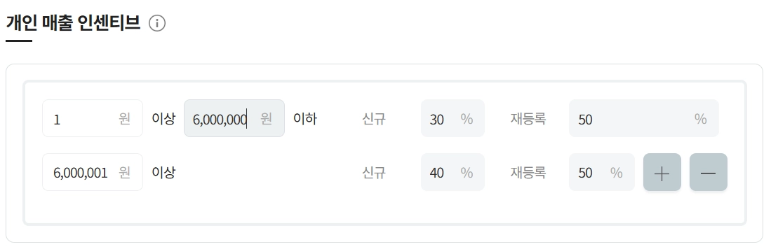 각 금액 구간별 신규,재등록 인센티브 조건을 설정 할 수 있습니다.