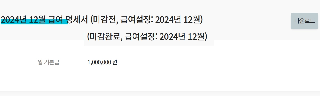 해당월의 급여 명세서를 확인하고 엑셀 파일로 다운받을 수 있습니다.