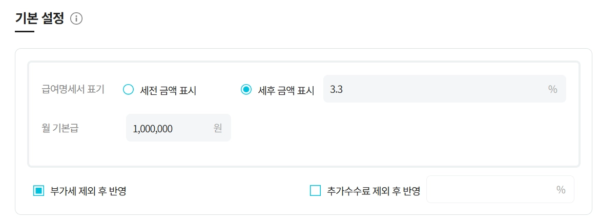세금의 %와 기본급을 설정 할 수 있습니다.