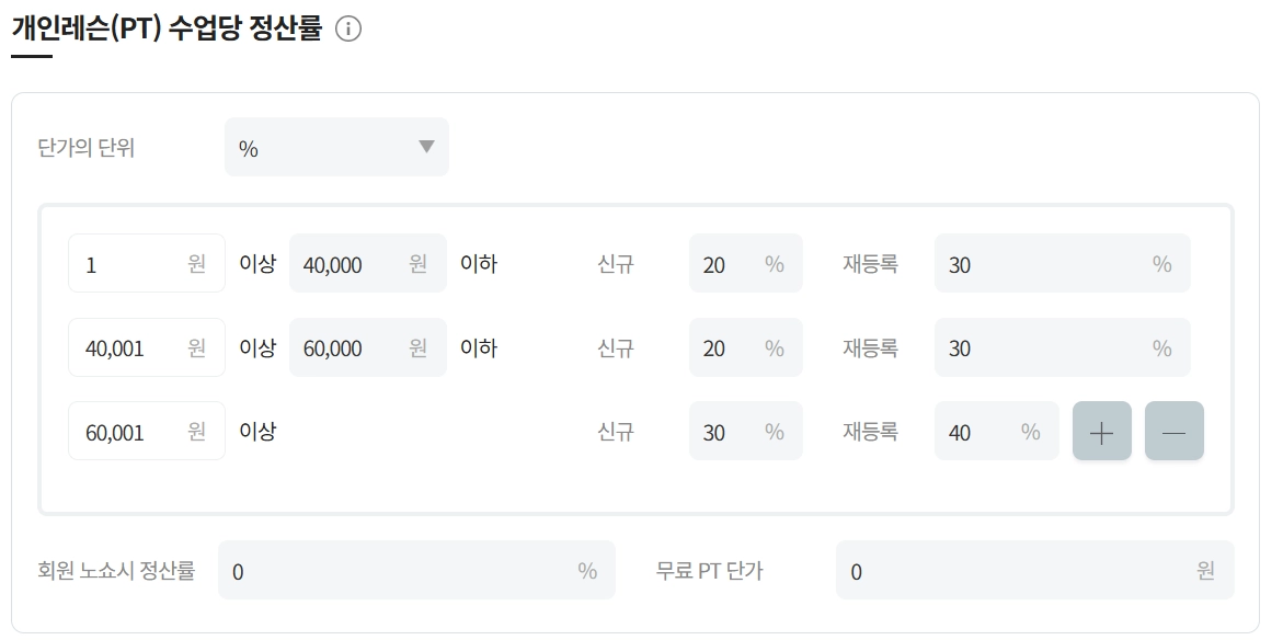 회원 노쇼시 정산률 설정 후 무료PT노쇼시 무료PT단가에 대한 노쇼시 정산률이 적용됩니다.