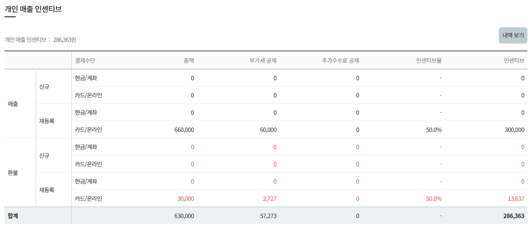 개인 매출 인센티브 우측의 내역보기를 누르면 간편하게 볼 수 있습니다.