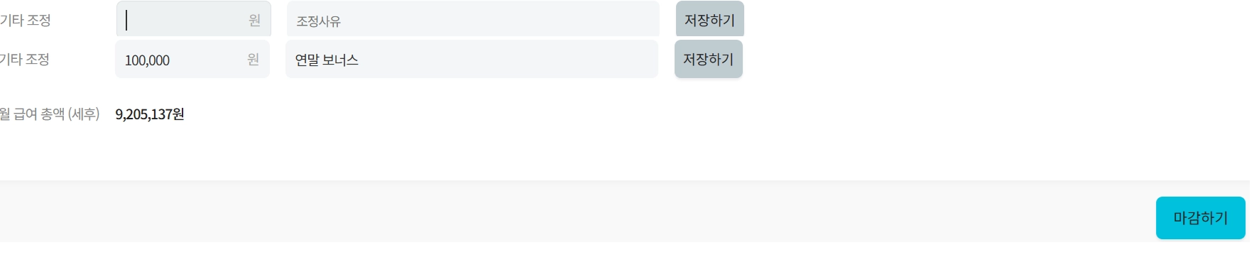 기타조정: 추가 보너스가 있다면 금액, 사유 입력 후 저장하기를 누르면 하단 월급여총액에 반영됩니다.