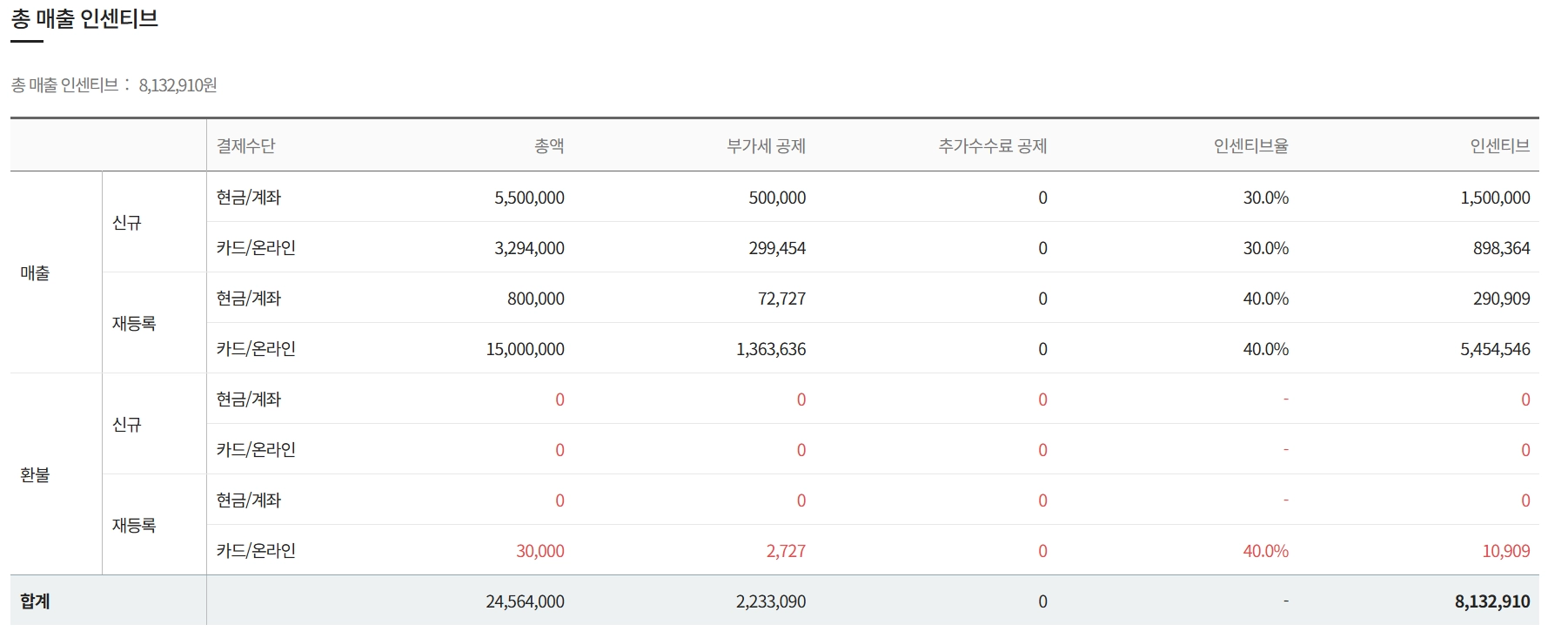 해당 직원의 해당 월 총 매출 인센티브 현황입니다.