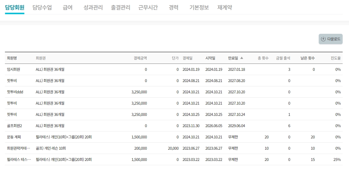 담당회원 : 강사가 담당하고 있는 회원 목록을 조회할 때 사용합니다. 해당 강사 좌측의 체크박스를 체크한 다음 회원목록을 누르면 조회할 수 있습니다.