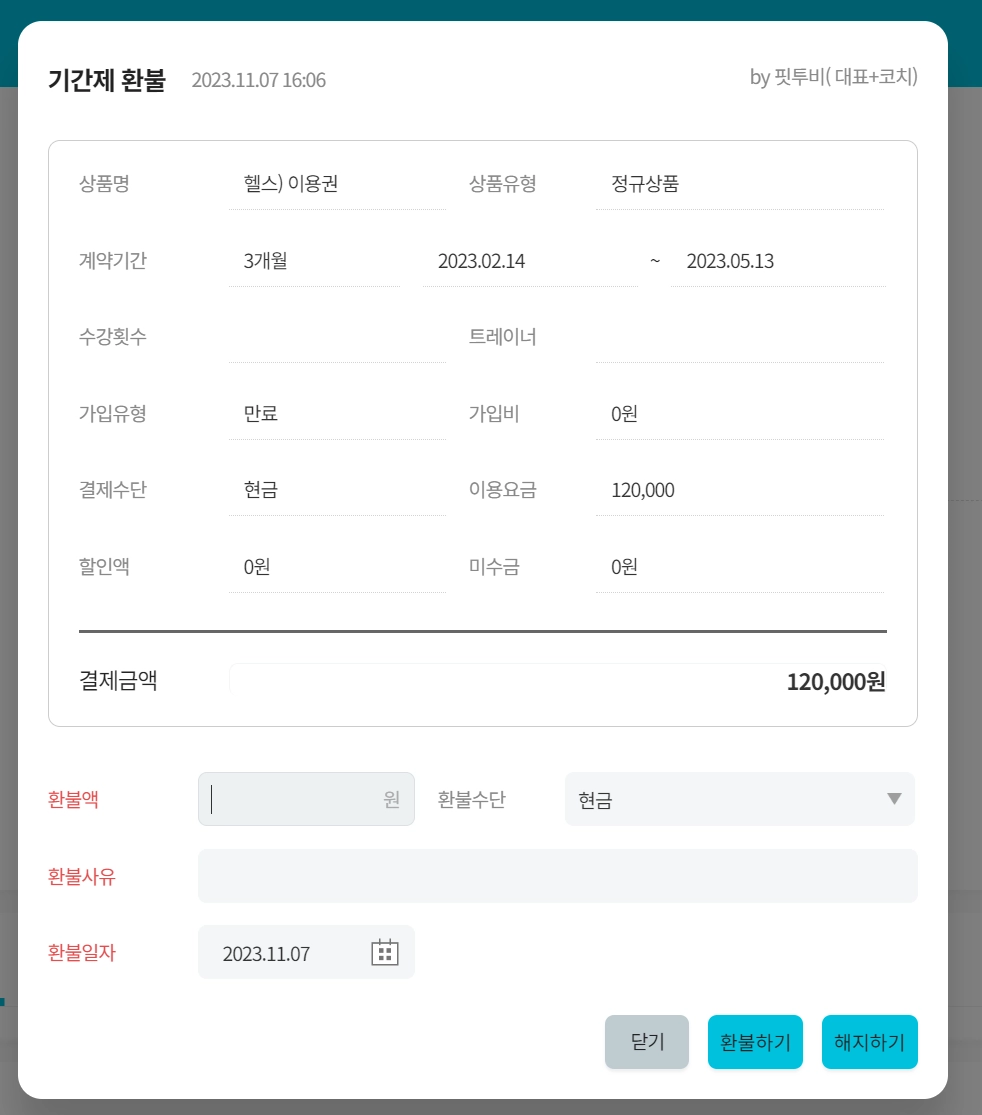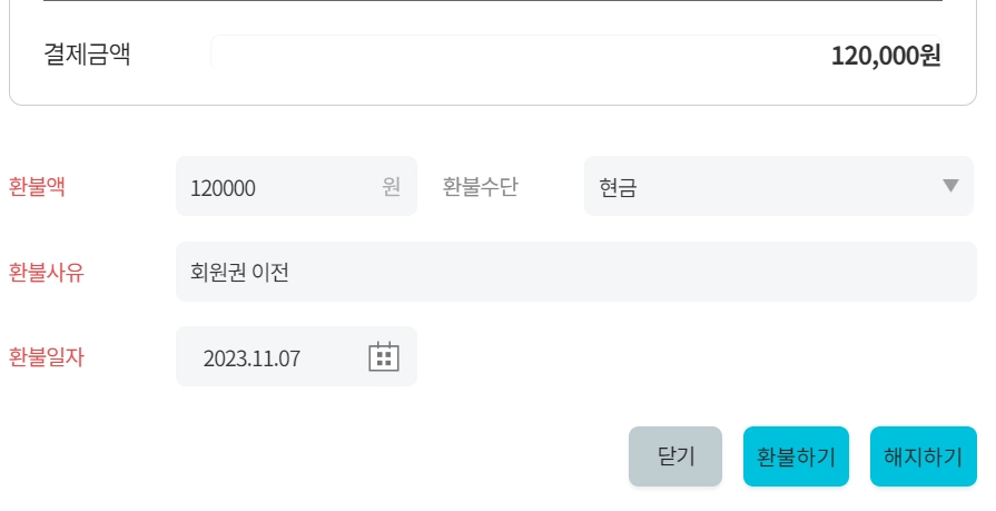 해지하기 - 회원권도 만료시키고 금액도 환불하기