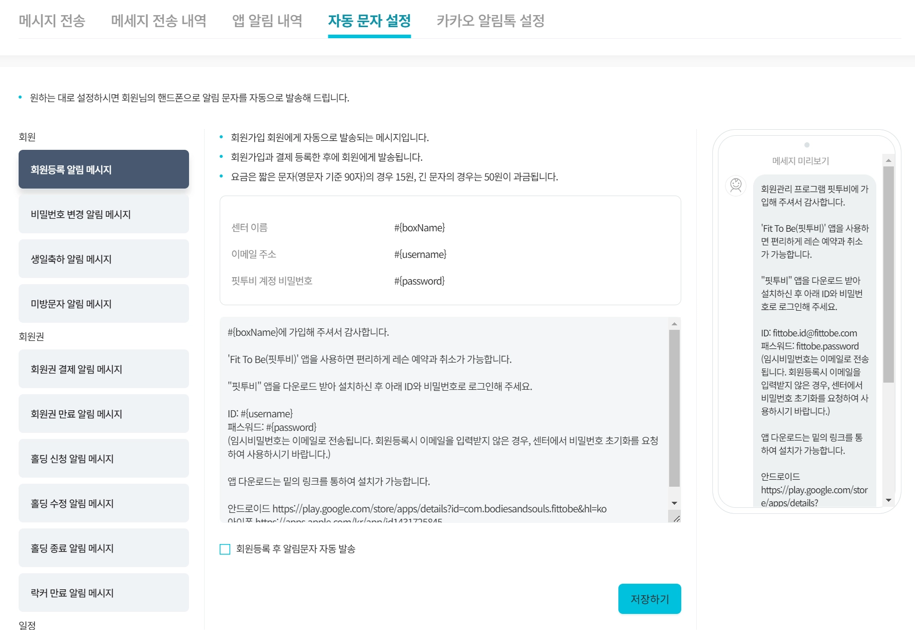자동 문자 메시지 기능을 사용하게 되면 편리하게 회원에게 핏투비 앱을 소개할 수 있습니다.
