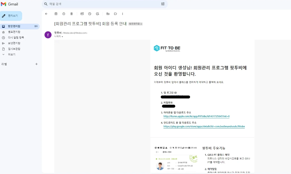 가상 이메일 등 이메일을 받지 못한경우 핏투비 앱을 이용하려면 센터에서 비밀번호를 초기화 해야 합니다.