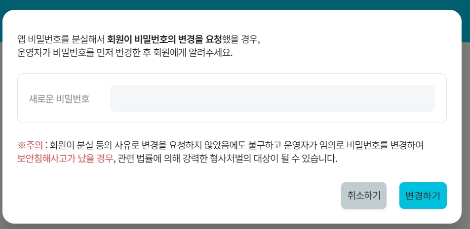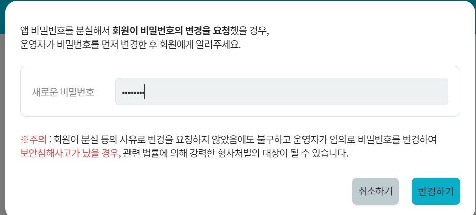센터에서 정한 비밀번호를 설정하여 회원에게 알려주시면 핏투비 앱을 사용할 수 있습니다.