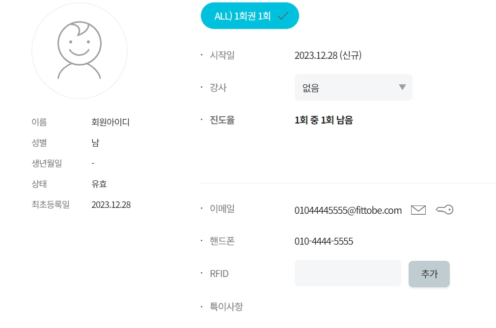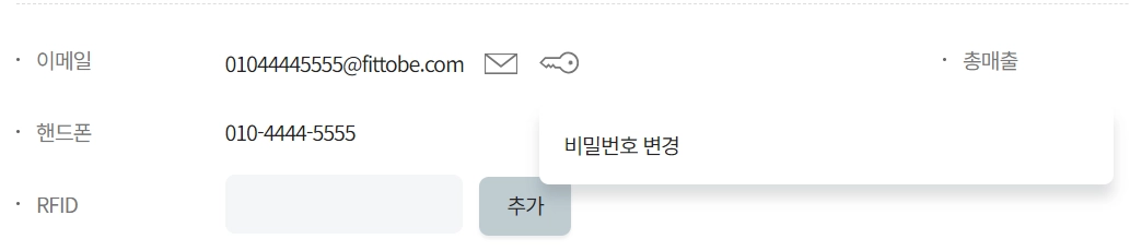 이렇게 가상의 이메일(@fittobe.com, @ftb.com, @abc.com 등) 로 회원의 아이디를 만든 경우 열쇠모양 버튼을 눌러 비밀번호를 초기화 한 후 회원에게 직접 알려드려야합니다.