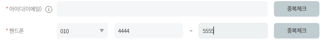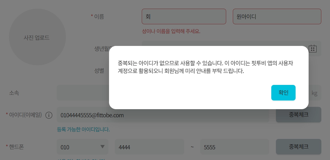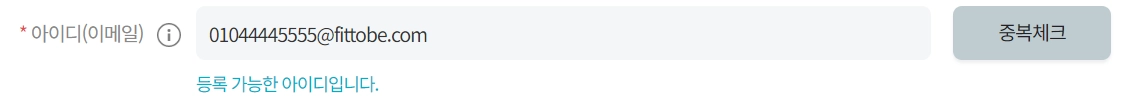 회원의 이메일을 모를경우 핸드폰 번호를 먼저 입력하고 중복체크 버튼면 가상의 이메일이 생성됩니다.