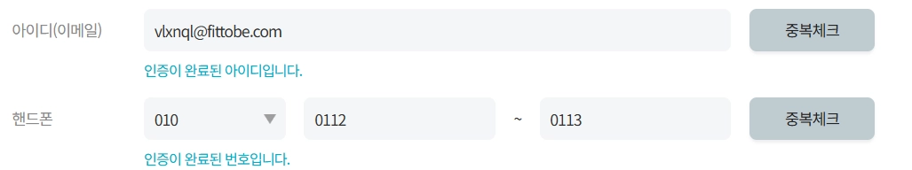 로그인에 필요한 필수 정보입니다. 만약 이메일 등록이 어려울경우 핸드폰 번호를 먼저 입력하고 중복체크를 누르면 임시 이메일이 생성됩니다.