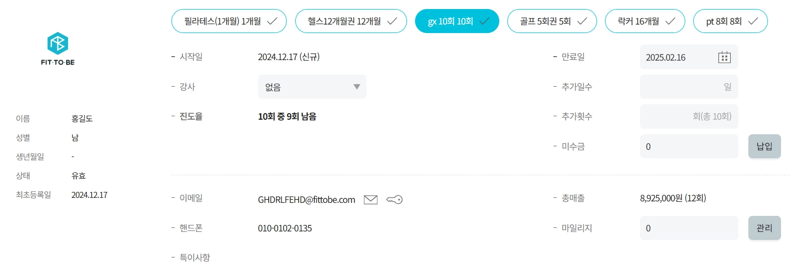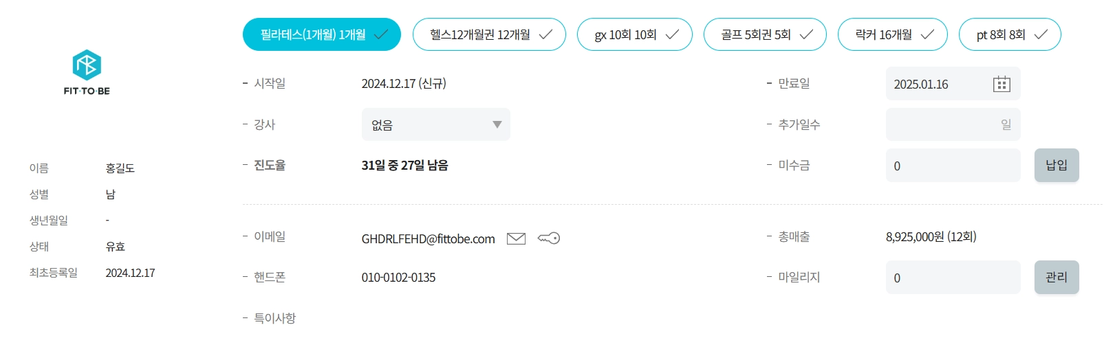 회원을 선택하면 회원의 기본 정보가 나타납니다.