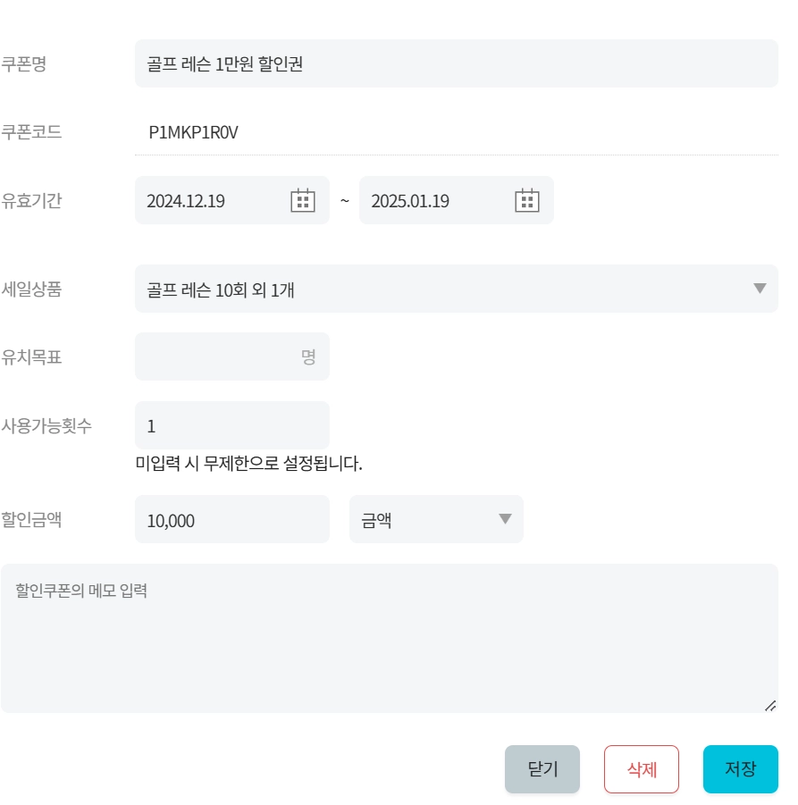생성된 쿠폰을 클릭하면 수정 및 삭제를 할 수 있습니다.