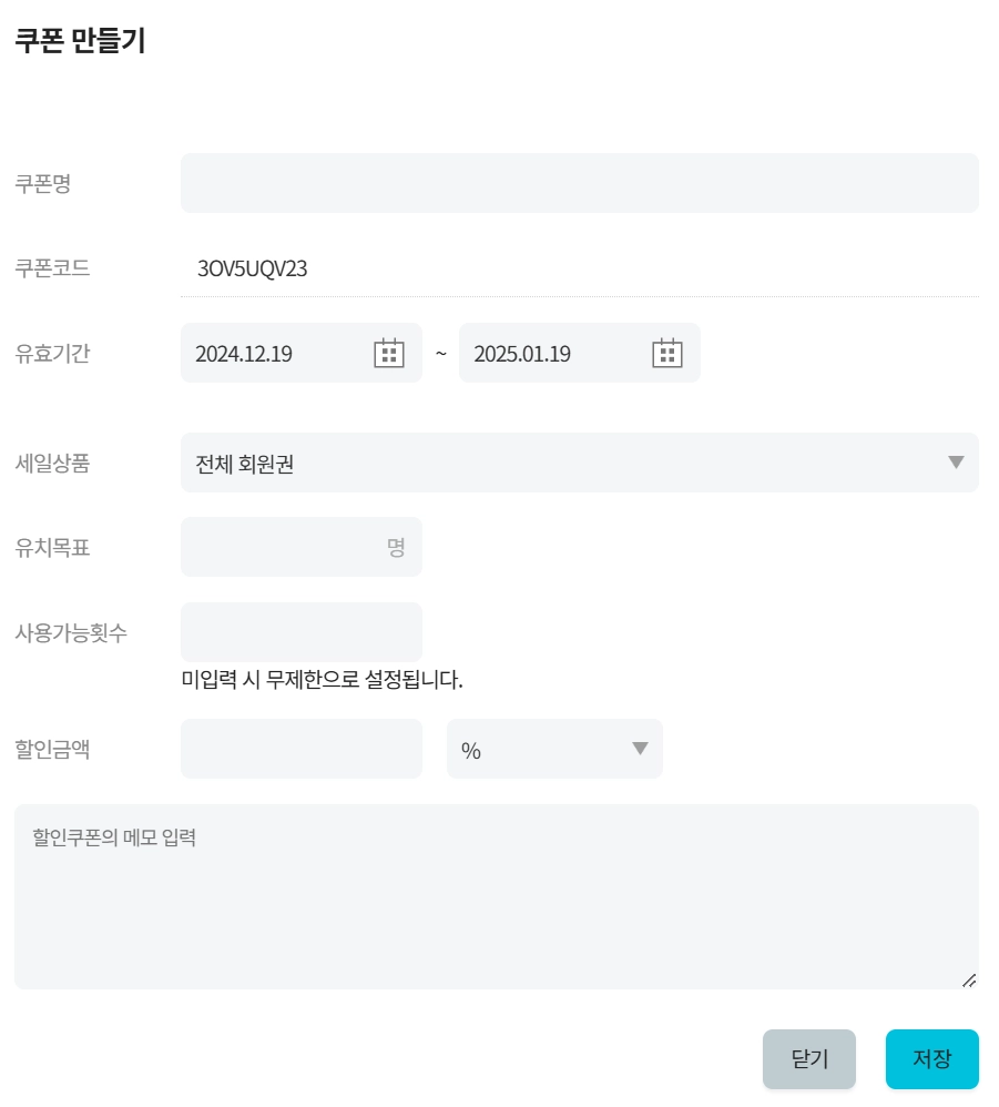 쿠폰 등록을 클릭해서 새로운 쿠폰을 만들 수 있습니다.