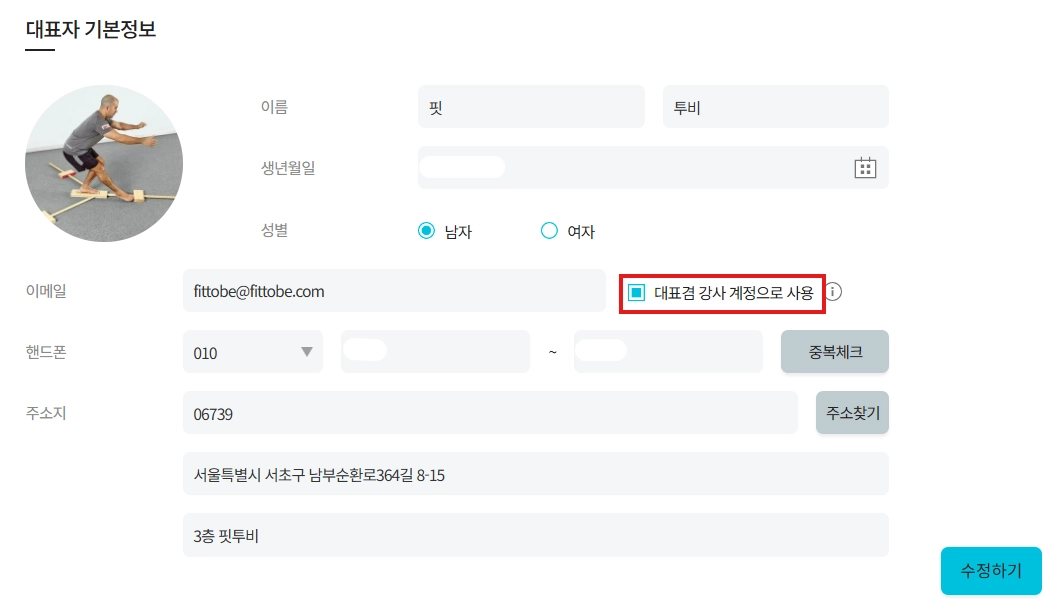 대표임과 동시에 수업도 진행하는 강사라면 체크표시에 클릭 합니다.