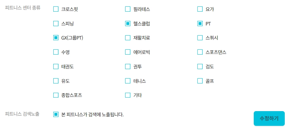 피트니스 검색노출을 설정 할 수 있습니다. 체크해제를 하면 노출이 되지 않습니다.