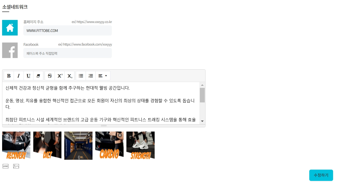 센터의 홈페이지와 SNS 주소를 설정 할 수 있습니다.