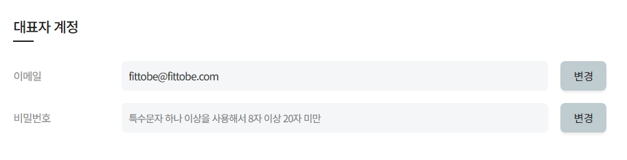 대표자 계정의 기존 이메일(아이디)과 비밀번호를 변경 할 수 있습니다.