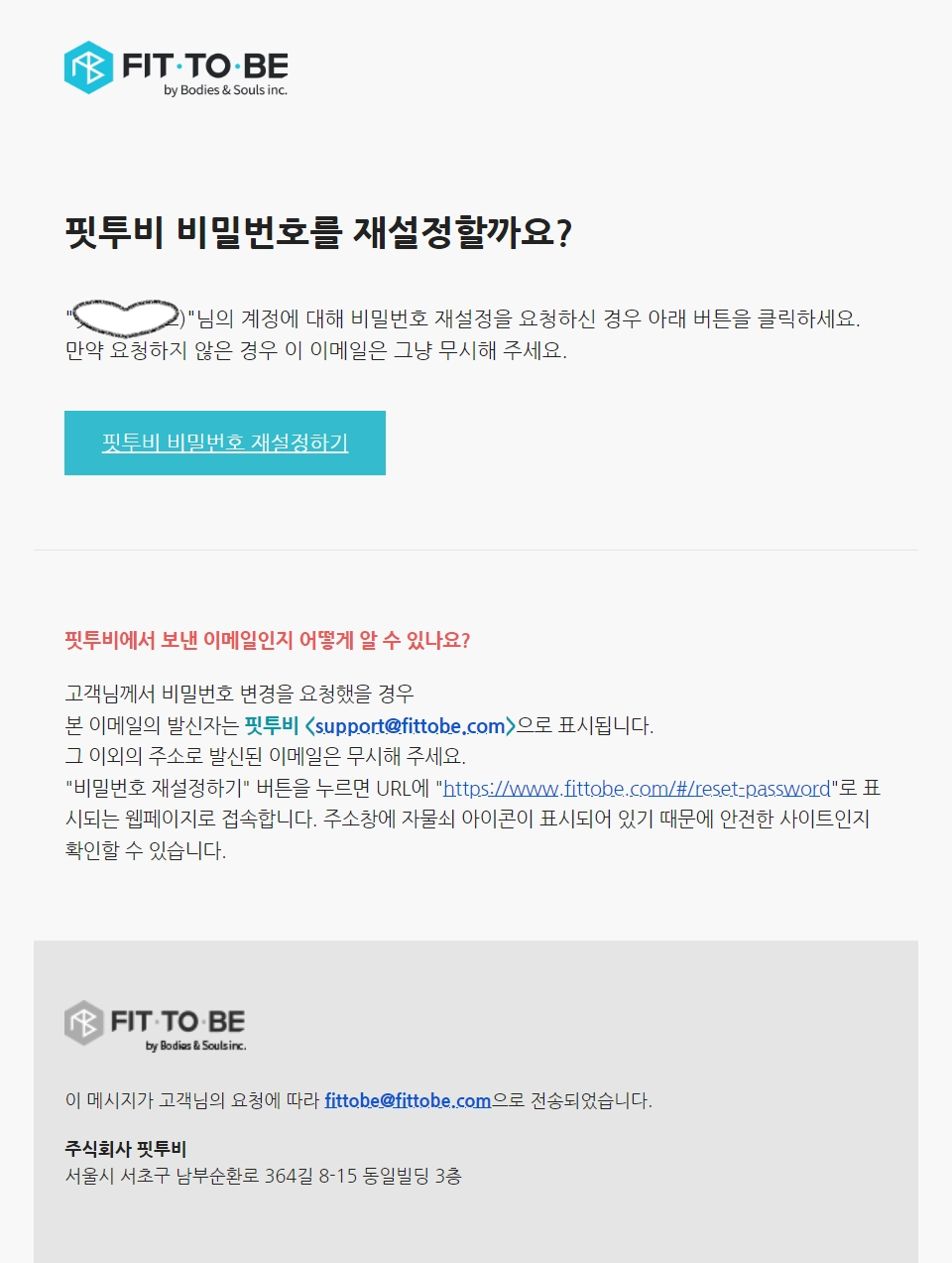 본인의 이메일로 들어가 메일함을 보면 위와 같은 이메일이 수신된 것을 확인할 수 있으며, 비밀번호 재설정하기 버튼을 통하여 새로운 비밀번호를 설정할 수 있습니다.