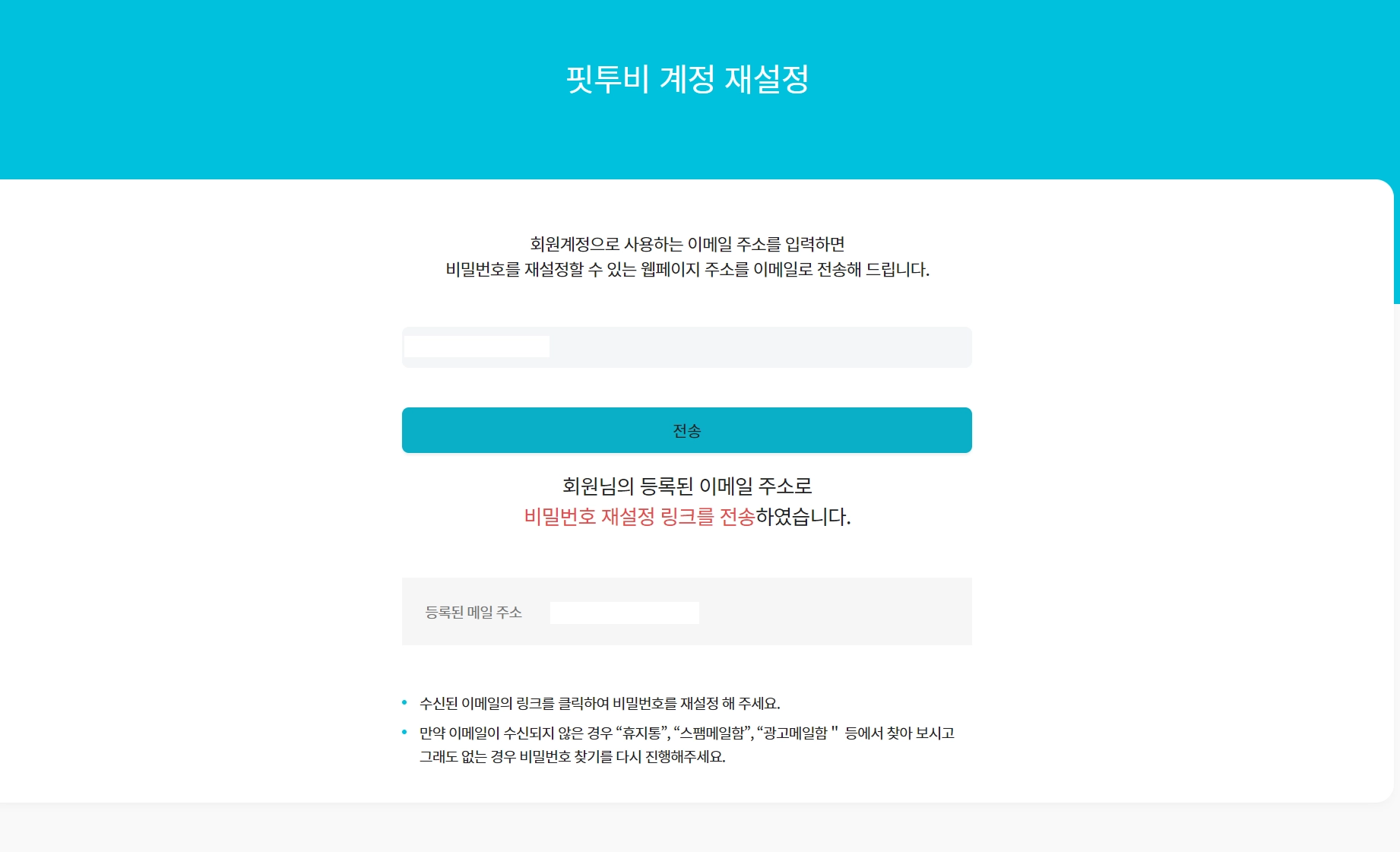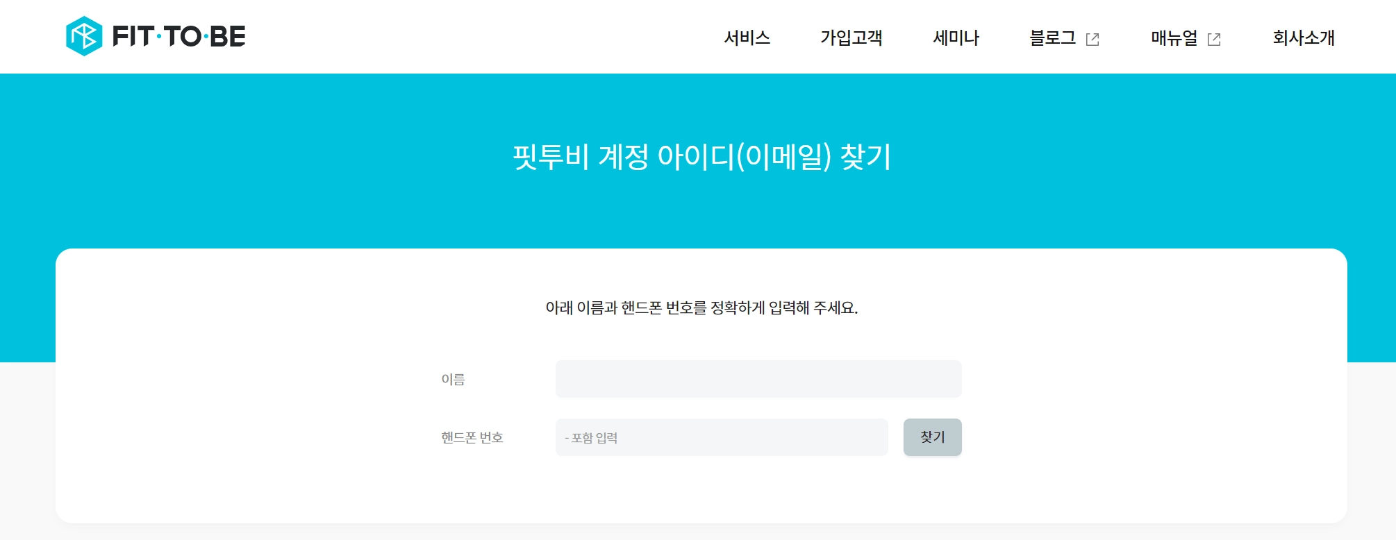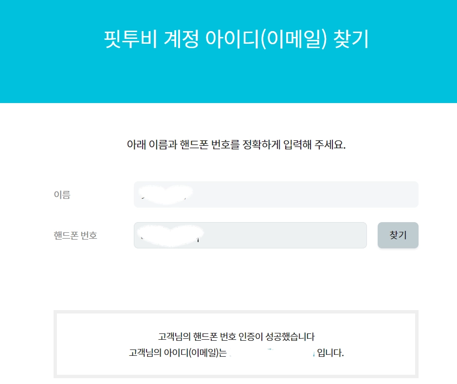 핸드폰 번호 인증이 성공하면 핏투비 계정을 찾을 수 있습니다.