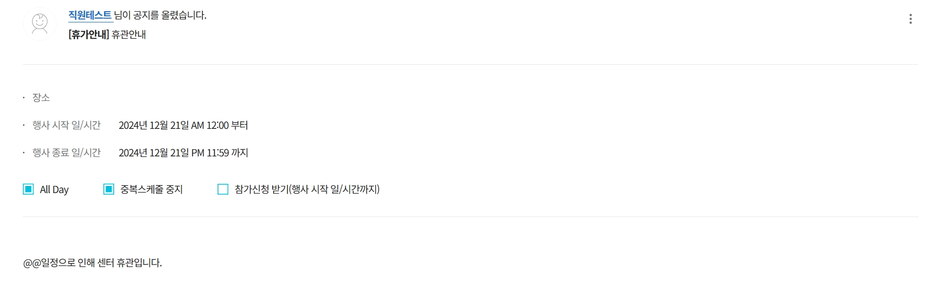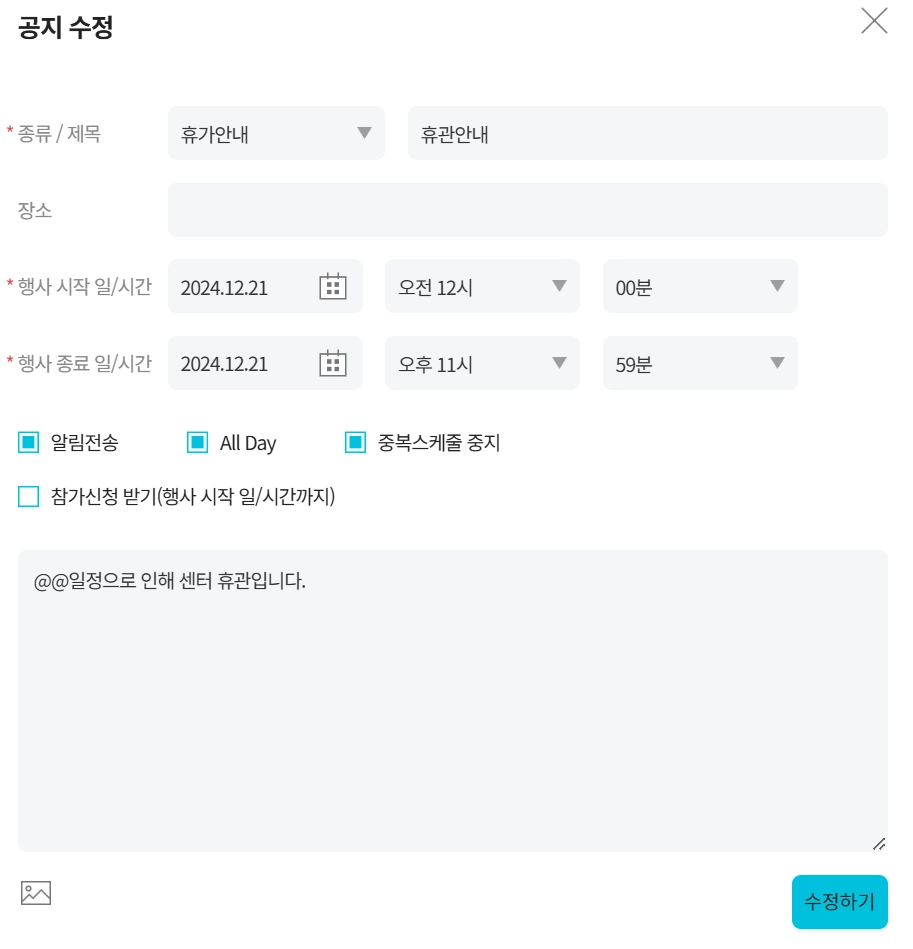 공지를 수정하고 알림전송을 클릭하면 수정된 공지가 회원들에게 전송됩니다.