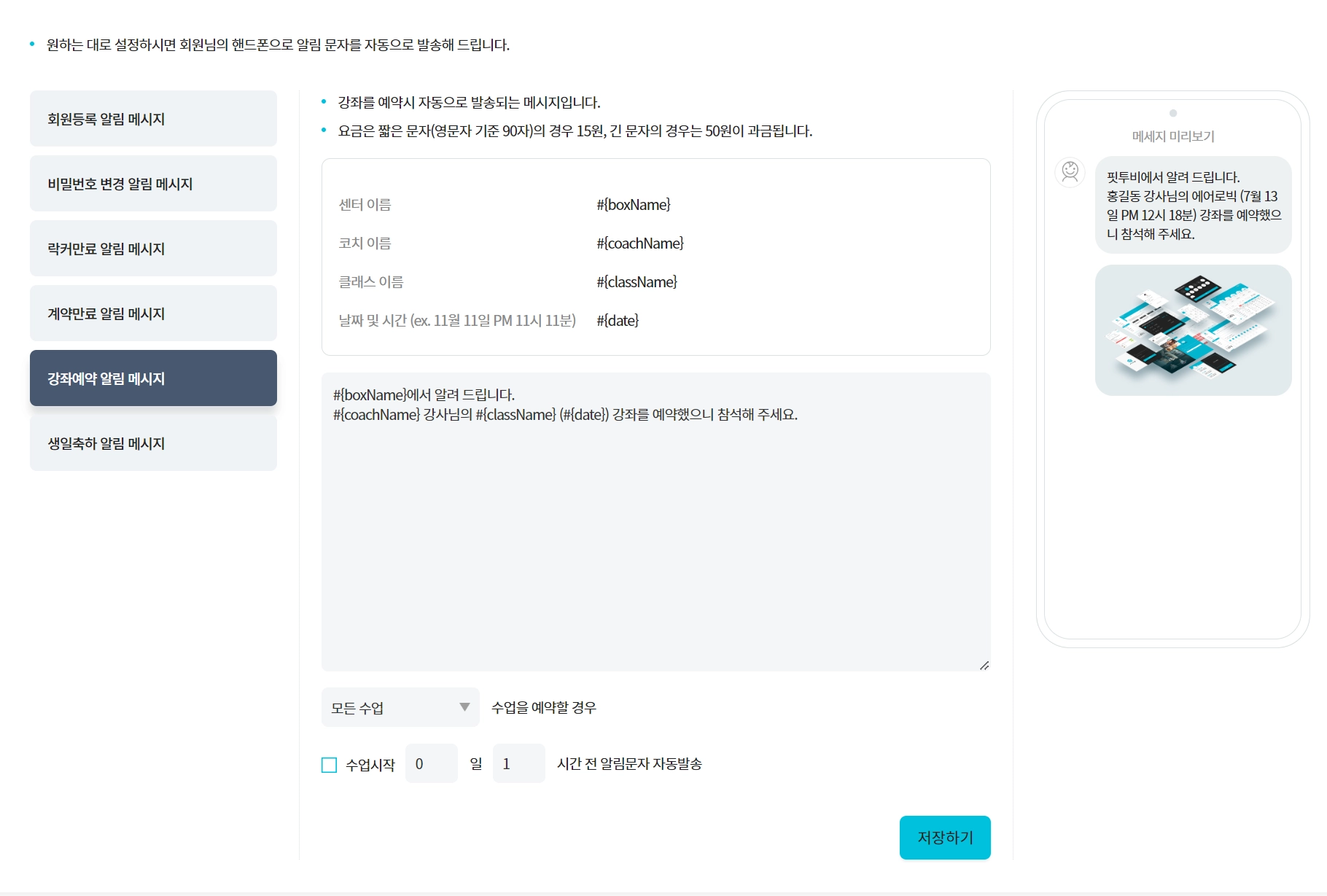 아래의 링크에서 핏투비가 제공하는 기본적인 알림톡 문구에서 센터에서 원하는 문구로 수정이 가능합니다.