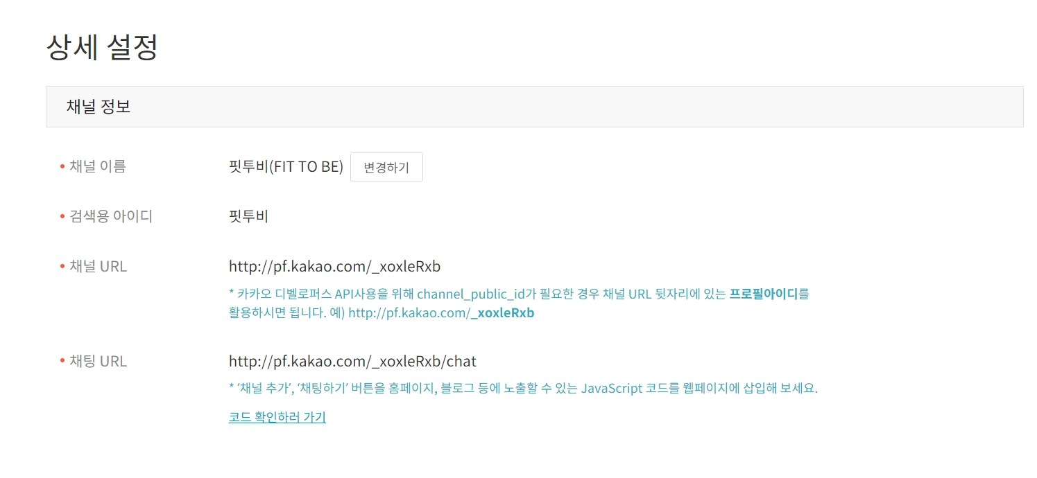 채널 아이디는 카카오톡 채널 관리자 센터 - 관리 - 상세설정에서 볼 수 있습니다.