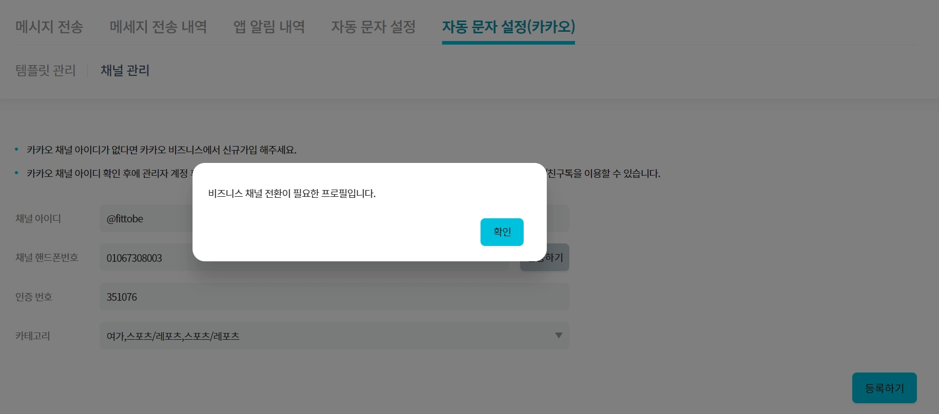 채널 관리에서 카카오톡 계정 연동을 완료 후 반드시 템플릿 관리에서 문구 수정 후 등록하기, 검수 요청 까지 완료를 해야 정상적으로 동작을 하게 됩니다.