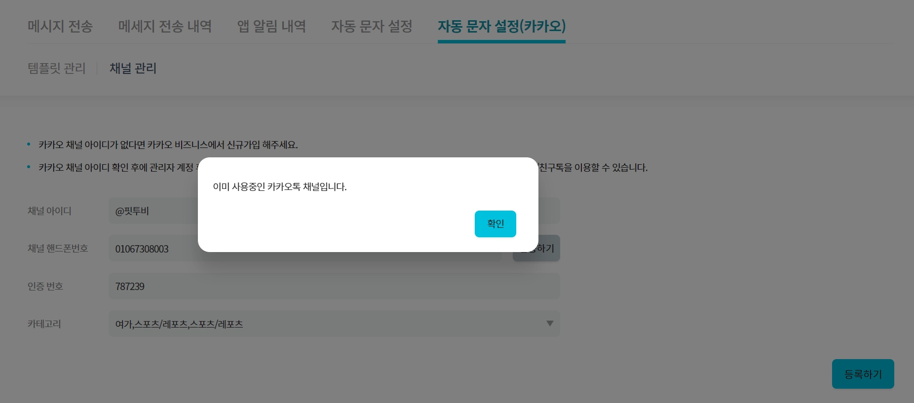 만약 사용중인 카카오톡 채널이라고 뜨면 채널을 하나 더 개설해서 신청해주세요.