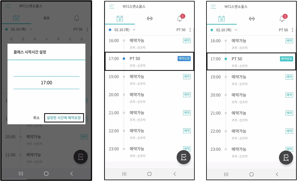 수업을 선택하게 되면 회원과 연결되어 있는 트레이너의 수강 가능한 시간이 나오게 됩니다. 회원이 원하는 시간대를 선택 후 예약요청을 하면 트레이너에게 요청알림이 갑니다.