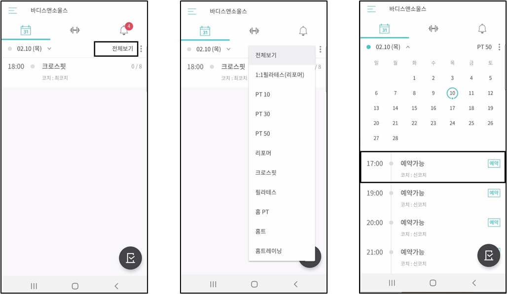 회원이 예약을 하려는 경우 ‘전체보기’ 버튼을 누르면 회원이 수강할 수 있는 수업 목록이 나오게 됩니다.