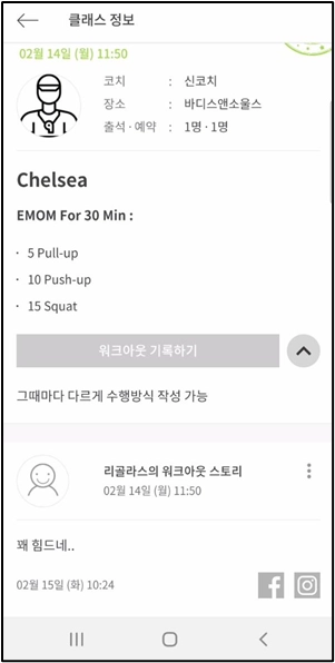 코치가 해당 스케쥴에 실시할 운동 계획을 미리 일정에 추가해놓았을 경우에는 해당 일정에 어떤 운동 계획이 잡혀있는지 미리 조회해볼 수 있습니다.