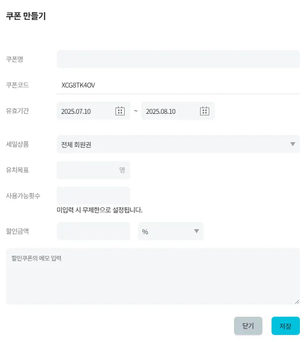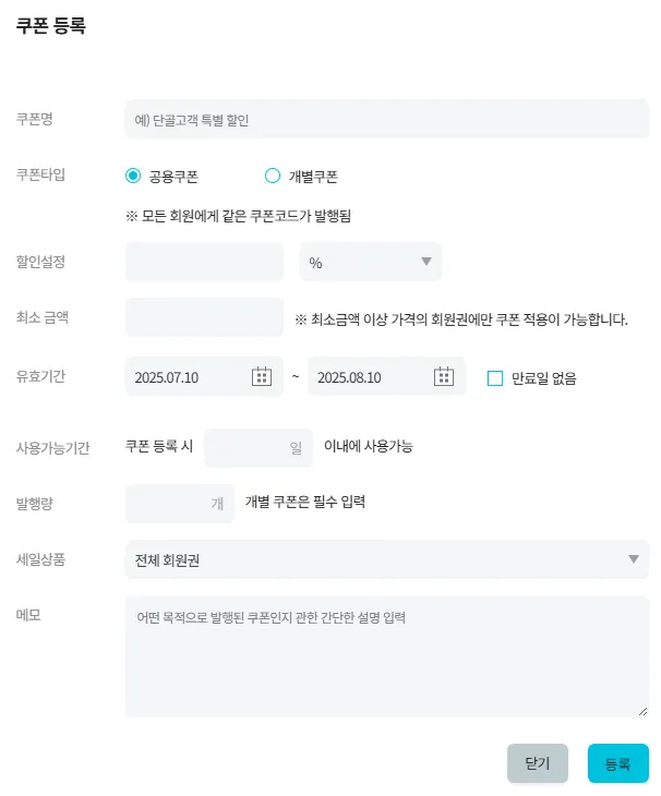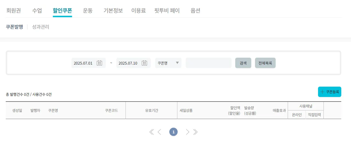 할인쿠폰의 기능은 설정- 할인쿠폰에서 쿠폰발행 및 발행한 쿠폰을 관리 가능합니다.