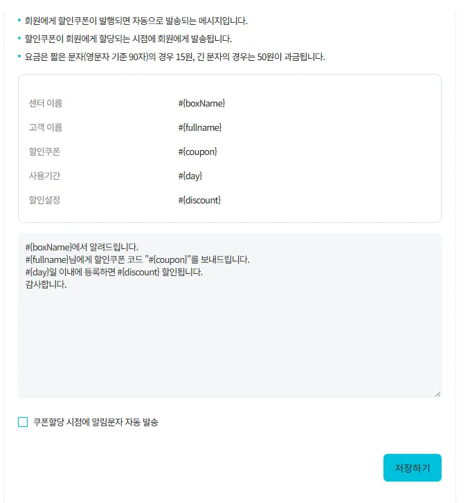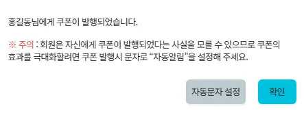 자동문자 설정을 통해 발행한 쿠폰을 회원에게 발행됨을 알려주는 문자전송도 가능합니다.