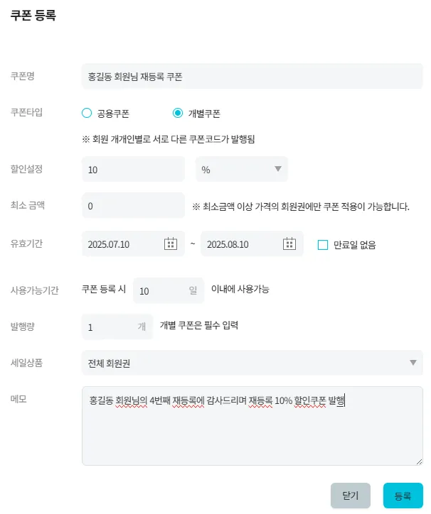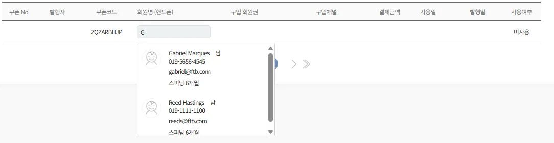회원명을 입력하여 해당 회원에게 쿠폰코드를 발송 가능합니다.
