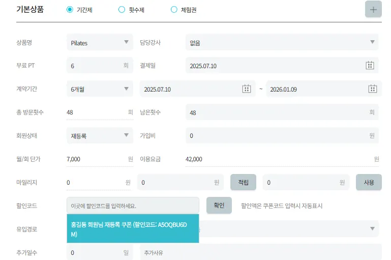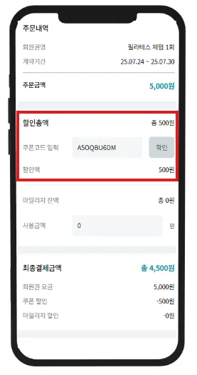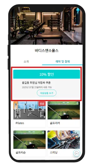 핏투비페이로 회원이 직접 결제시 센터가 설정해놓은 쿠폰 적용 회원권에 쿠폰 사용 가능