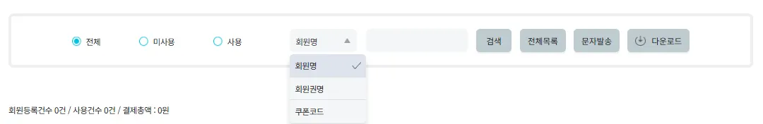 회원이름, 회원권 명, 쿠폰코드별 검색이 가능하며 바로 문자로 보낼 수 있습니다.