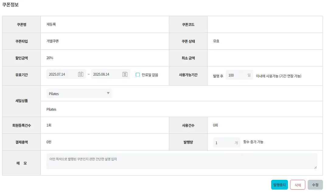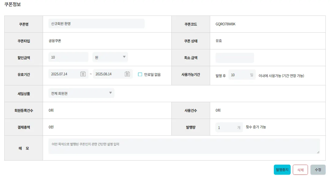 발행한 쿠폰을 클릭하여 수정 및 삭제가 가능합니다.