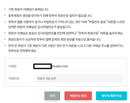 따라서 계정이 중복되었다고 팝업창이 뜨더라도 당황하지마시고 저희가 제시한 매뉴얼대로 진행해주시면 원활한 핏투비 사용이 가능하십니다.