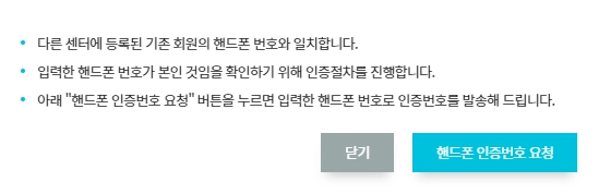 그 이유는 회원분께서 개별적으로 만든 계정과 센터에서 발급해주려는 계정이 중복된 이메일이나 전화번호를 가지고 있기 때문인데요. 이러한 팝업창이 뜨면 당황하지 않으셔도 됩니다.