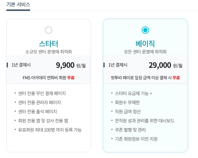 스타터요금제: 회원관리의 필요한 필수 기능들이 있는 요금제 입니다.(유효회원수 50명 이하)