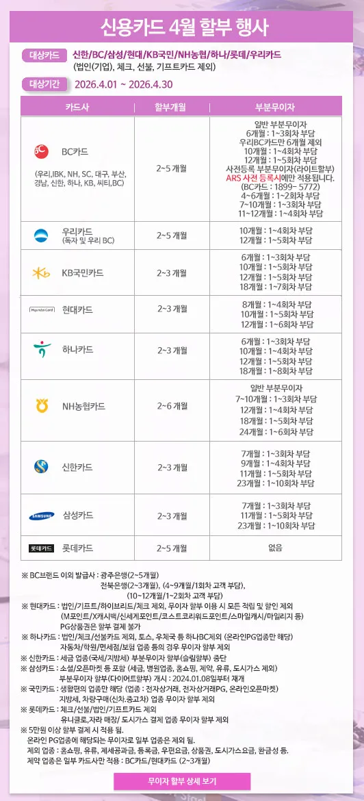 [핏투비페이] 4월 카드사 무이자할부 혜택 안내(04.01)