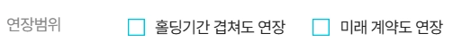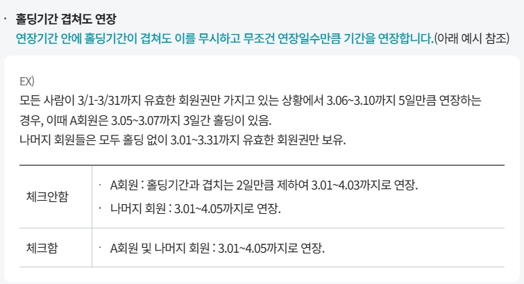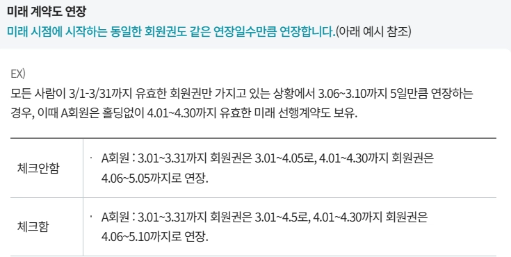 미래계약도 연장: 연속된 회원권을 가지고 있을경우 홀딩을 통해 뒤의 회원권이 자동 연장되는지 선택 할 수 있습니다.