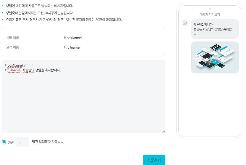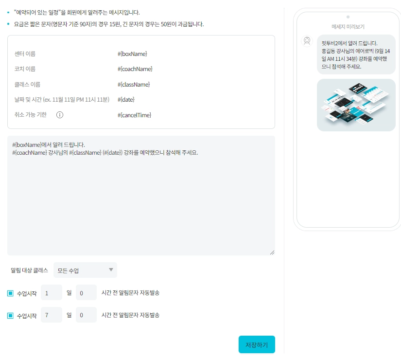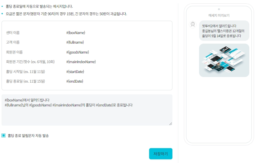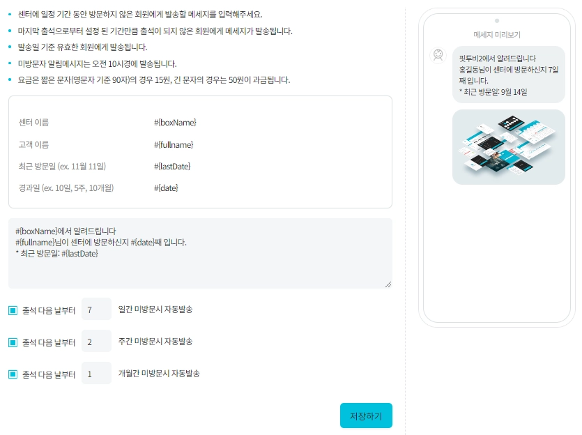 자동 문자 메시지 기능을 활용하여 회원님들과의 소통을 원활하게 이뤄지길 핏투비가 기원하겠습니다.
