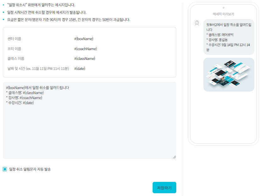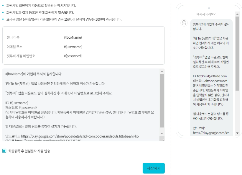 핏투비 자동 문자 메시지 항목 추가